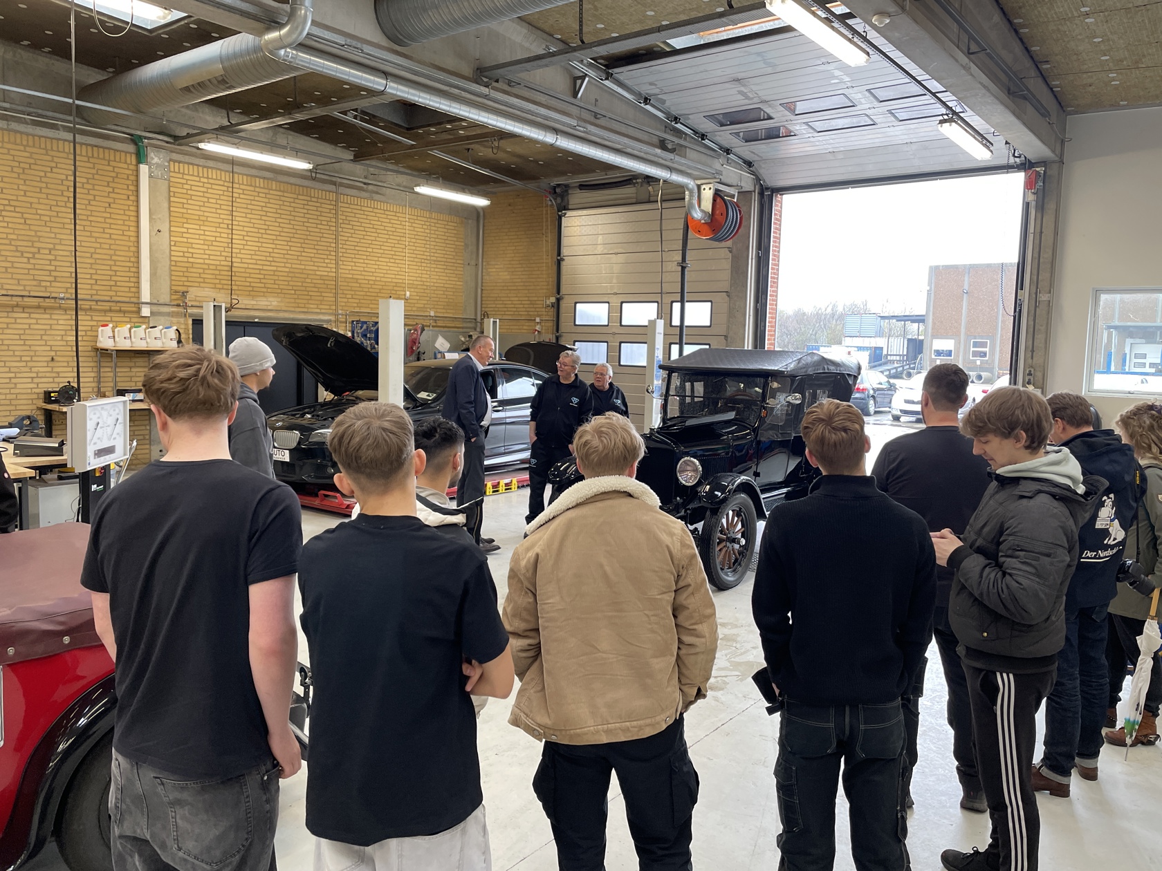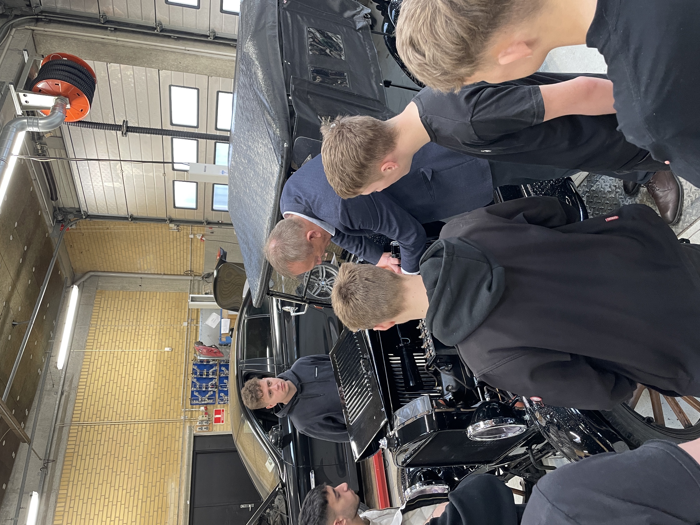 I værkstedet fortalte han om bilens historie, konstruktion og køreegenskaber. For eleverne blev det en konkret måde at opleve, hvordan mekanik har udviklet sig – fra de første biler til det, de selv arbejder med i dag.