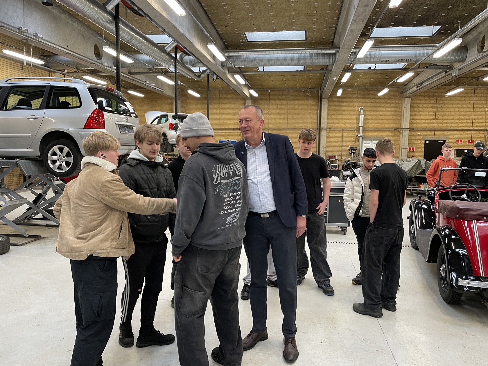 Eleverne fulgte nysgerrigt med og fik mulighed for at komme helt tæt på både bil og motor. Undervejs var der også tid til dialog, hvor borgmesteren spurgte ind til elevernes hverdag, deres vej ind på uddannelsen og deres muligheder for læreplads.